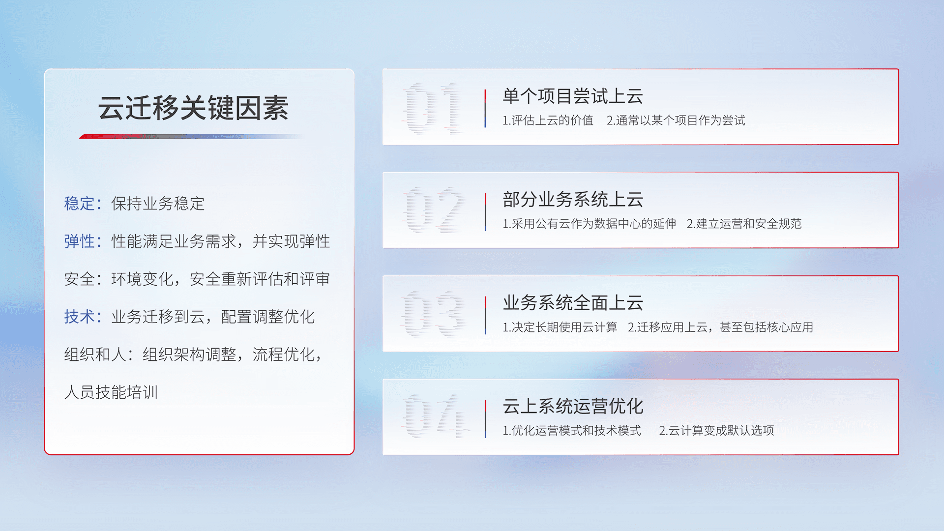 结合实际业务,,从规划设计、、、、云平台选型、、、、云原生改造、、、、数据迁移、、、、集成交付,,迁移全过程为客户识别最佳上云路径,,,,做好风险识别管理,,,,设计网络架构、、、身份权限、、、安全审计合规、、操作审计、、日志审计、、监控告警策略、、、多站点容灾设计等,,,,对云上基础设施进行整体规划,,,,提升IT治理水平,,,以满足弹性、、、高可用、、、高性能的需求。。。