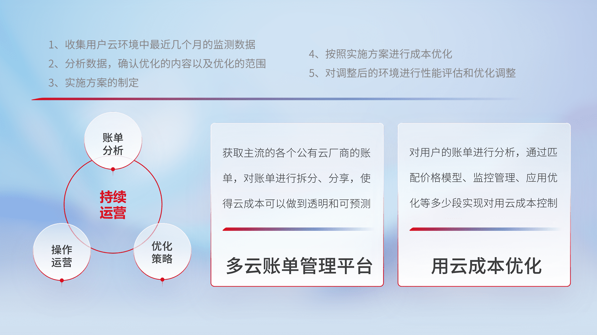 通过多云纳管,,,,以统一的资源数据模型把客户的云资源进行抽象和封装,,,,进而实现对多云资源的统一操作,,保障云资源管理的可靠性、、、、稳定性与可用性。。。。量身定制化运维内容,,配置、、开发运维、、补丁管理、、、备份、、、监控、、、、认证和访问管理、、、审计和日常巡检等,,保障在用云过程中的可靠度,,,稳定度以及高可用率。。